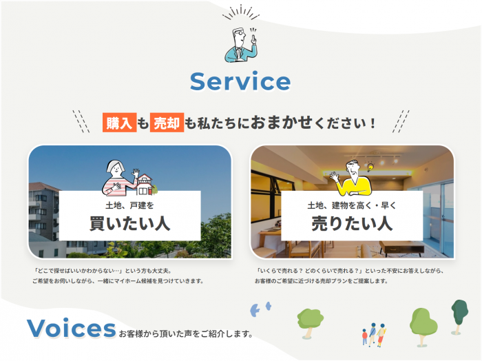 不動産業界特有の堅苦しさや敷居の高さを払拭するため、サイト全体に柔らかなタッチのイラストを配置しました。